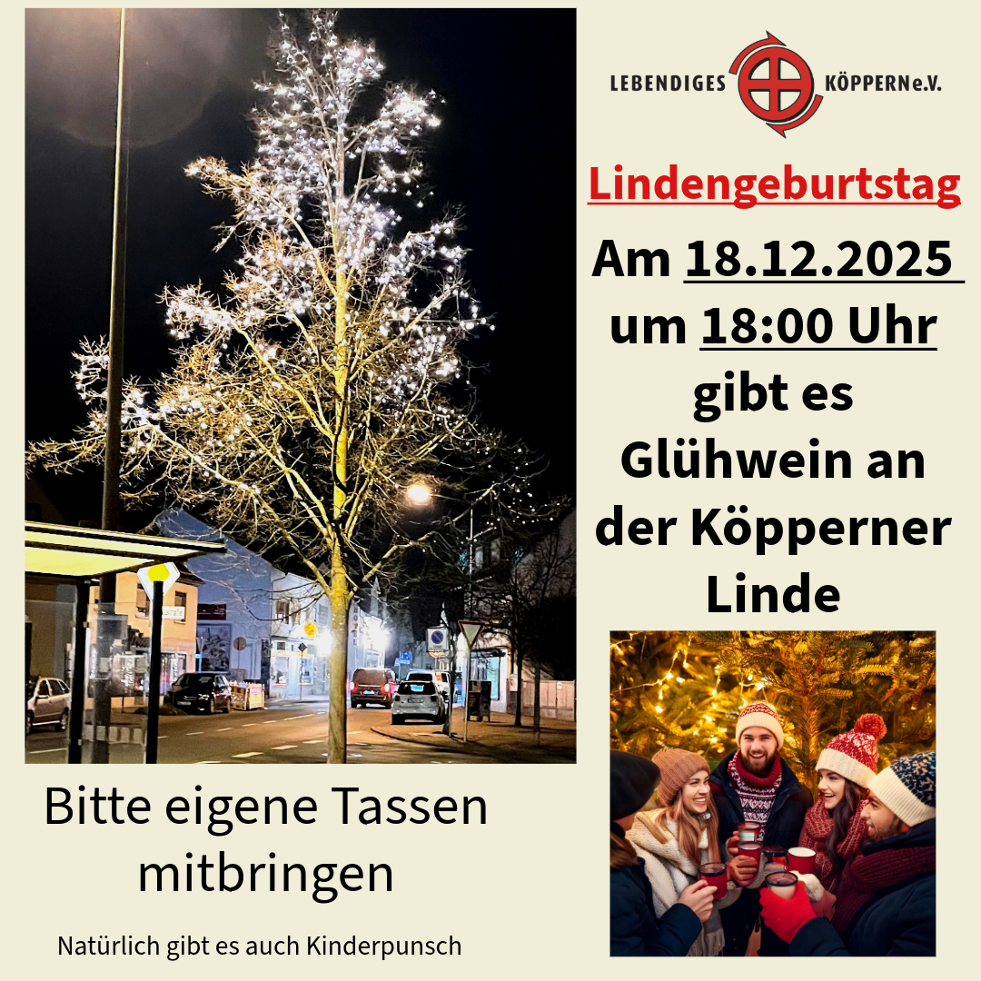 Donnerstag, 18.12.2025 um 18:00 Uhr wird es an der Köpperner Linde wieder gemütlich. Wir erinnern an das Jahr 2009 als mit Hilfe der Spenden unseres Vereins eine größere Linde gepflanzt wurde.
